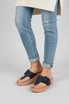 Look Bohémio de Verano: Combínalas con vestido midi floral o de tela natural y accesorios dorados. El herraje metálico circular dorado en el punto de unión aporta ese toque de elegancia que transforma la sandalia playera en una pieza de moda bohémia sofisticada. El Azul con vestido blanco o crema es el look bohémio más fresco y contemporáneo.