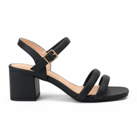 Capellada: Sintético con textura tipo cuero folia/grano finoTiras: Tubulares acolchadas (redondeadas) sobre el empeineAjuste: Correa delgada al tobillo con hebilla metálica ajustableTacón: Bloque (grueso) de altura media ~5-6 cm, base anchaSuela: Alta durabilidad con acabado antideslizante